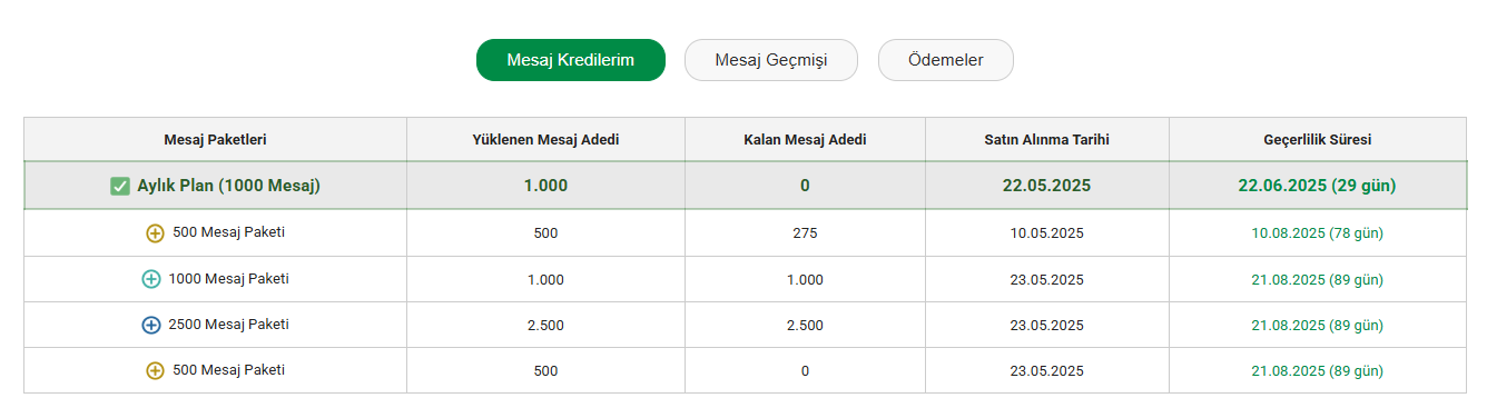 Aylık planınızın 1000 mesaj kredisi her ay yenilenir.