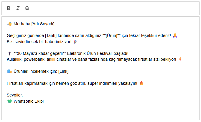 Ad, ürün, tarih gibi alanları otomatik yerleştirerek her mesajı özel hale getirin.